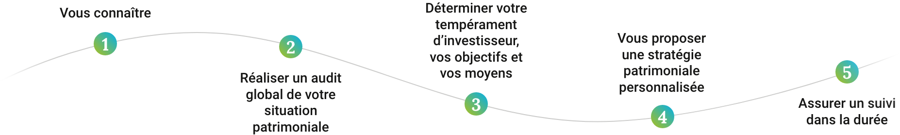 Après avoir réalisé un audit global de votre situation patrimoniale, nous déterminons avec vous votre tempérament d’investisseur, vos objectifs et les moyens dont vous disposez pour atteindre ces objectifs.